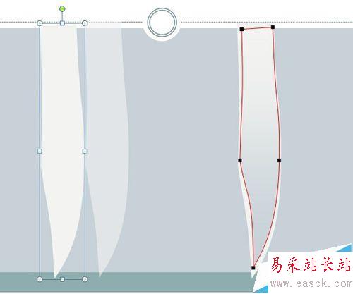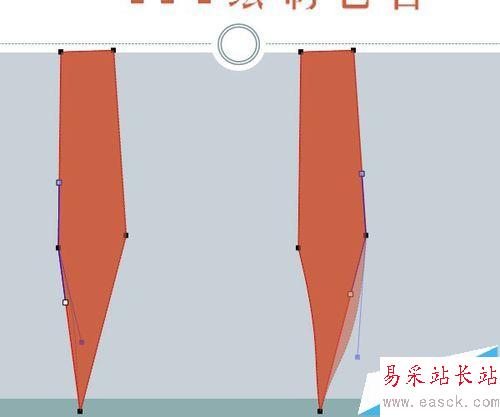 5、點擊左側中部節點,節點兩邊會出現曲柄,按住下方曲柄如圖拖動,使曲柄所在線條向內彎曲。右側同樣,曲柄外拉產生一個向外的弧線。