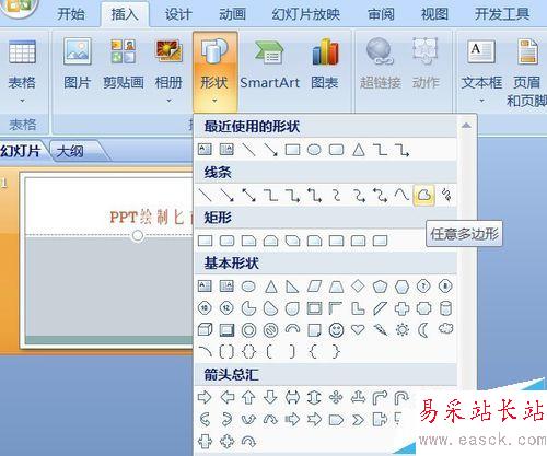 2、調出形狀工具。插入——形狀——任意多邊形。