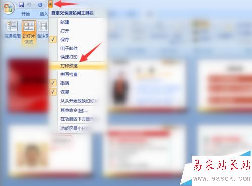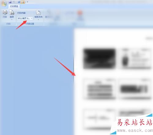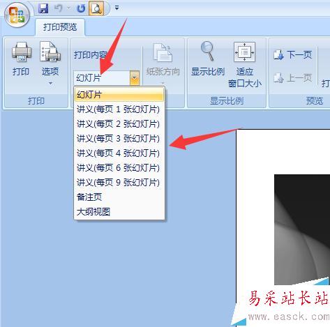 4、看到箭頭所示的打印內(nèi)容“幻燈片”,點(diǎn)擊會(huì)出現(xiàn)一個(gè)下拉菜單。我們可以選擇。