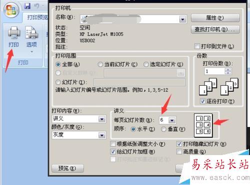 6、當(dāng)然,我們也可以在選擇打印預(yù)覽后,直接選擇打印機(jī)的設(shè)置,可以看到箭頭所示的“每頁(yè)幻燈片數(shù),6頁(yè)”還有預(yù)覽的圖示。這里是再次的確認(rèn)是否一致。避免打印后發(fā)生錯(cuò)頁(yè)的現(xiàn)象。