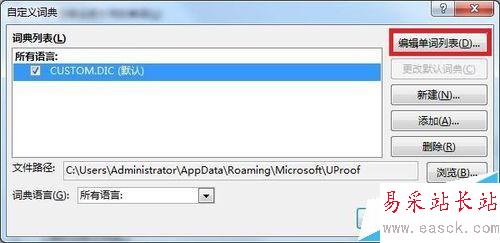 5、在自定義詞典對話框中,點擊右側(cè)的“編輯單詞列表”。