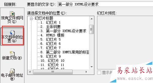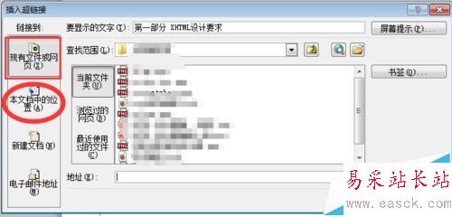 3、默認(rèn)情況下是鏈接到“現(xiàn)有文件或者網(wǎng)頁”下面的“當(dāng)前文件夾”,我們需要選擇下一個“本文檔中的位置”