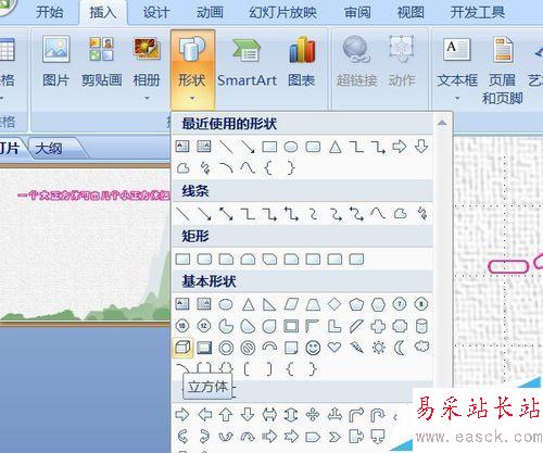 1、首先繪制出大立方體。插入——形狀——立方體。