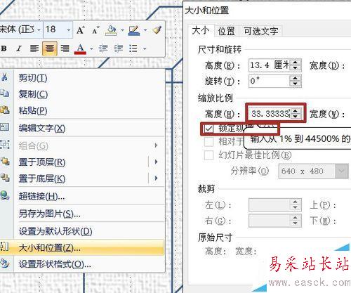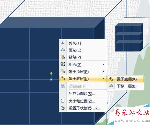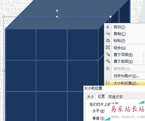 4、選中復制的立方體,右鍵——大小和位置里,鎖定縱橫比,縮放比例其中任一個中輸入33.33333%(呵呵,三分之一)。填充上顏色(隨個人喜好)。