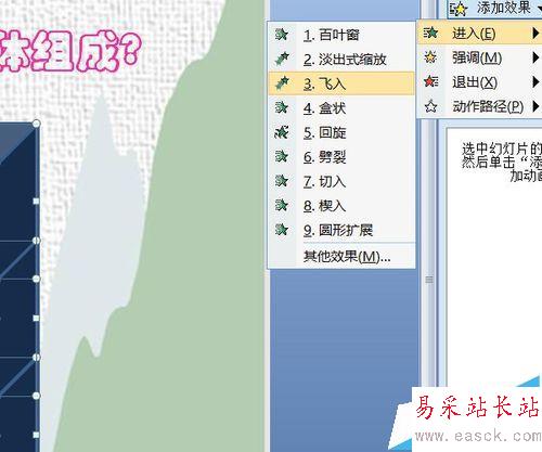 2、所有小立方體保持上一步選中狀態(tài)(如果沒有,撤消鍵返回上一步。不要試圖用選擇框框住再次全選,那會將最大的立方體也選中,為后面增添麻煩。),動畫面板里添加效果——進入——飛入(這一步動畫效果自選)。如果大立方體也被選中添加了動畫效果,點擊大立方體,在動畫效果中刪除高亮顯示的效果。