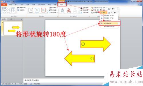 5、將復制的形狀旋轉180度(選中形狀,通過“格式”選項卡中的“旋轉”選項進行旋轉)。