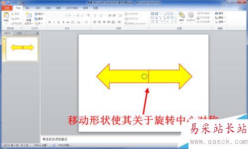 13、此時我們需要的效果就實現了,播放一下看看效果吧。這種方法的核心就是復制一個相同的形狀,將其設置為透明,然后組成一個新的圖形關于旋轉中對稱,我們看到是圖形繞著非中心旋轉,實際是另一個圖形繞著中心在旋轉。