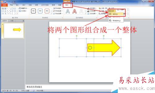 10、將兩個圖形同時選中,然后選擇“格式”選項卡中的“組合”選項,將兩個圖形組合成一個圖形。這樣新的圖形的中心就是我們需要的旋轉中心了。