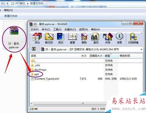 1、首先給PPTX文件復制一個備份。把備份的文件后綴名PPTX改為RAR,把這個PPTX文件當做一個壓縮包文件。