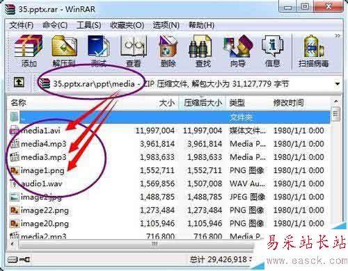 4、進入 【media】目錄后,就能看到PPTX文件中內嵌的視頻、音頻、圖片素材了。