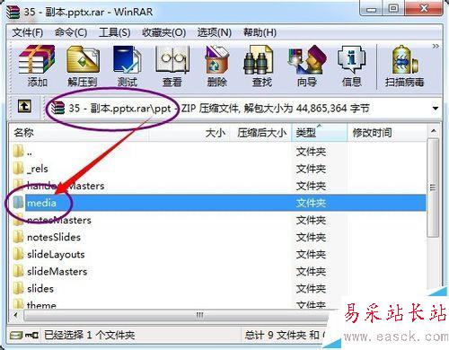 3、雙擊進入【PPT】目錄中,就能看到一個【media】目錄。