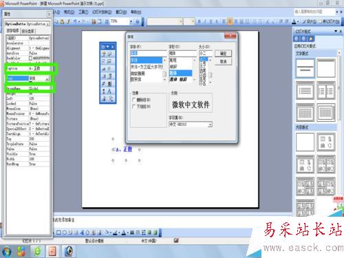 4、在屬性面板中修改caption屬性,修改為A、正數(shù),同時(shí)修改forcecolor顏色為黃色,設(shè)置為字體顏色,修改font屬性。