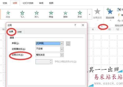 3、然后在【效果選項】一欄的右下角有一個小箭頭,點擊之后即會出現新的界面,點擊【效果】,在效果這一頁中選擇【動畫文本】,如圖所示。