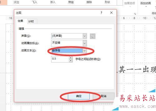 4、在【動畫文本】一欄中,選擇【按字母】,同時在下方還可以設置每個字母間出現的間斷時長,然后點擊確定。之后選中的文字即可出現打印機效果啦。如圖所示。