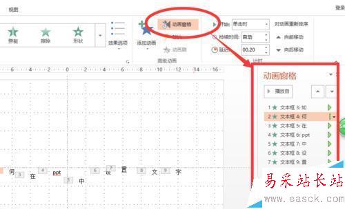 7、設置完后,在上方工具欄可以找到【動畫窗格】,點擊后會在界面右側出現一個工具欄,在這里可以對每個動畫進行間隔時間、出現順序等進行調整。如圖所示。