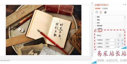 5、三維旋轉設置,右擊文本框,選擇設置形狀格式。其中,對三維旋轉進行設置,可以使用x、y、z三個數(shù)值進行調節(jié),以達到合適的逼真效果。