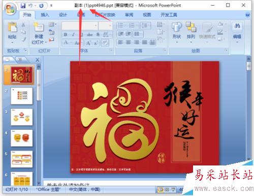 6、之后返回到PowerPoint編輯窗口,在標題欄上可以看到我們當前的文件是以【副本(1)】方式打開的。如圖所示;
