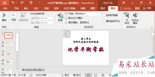5、點擊插入的音樂圖標,然后選擇音頻工具中的播放選項,這里可以設置是點擊鼠標開始播放音樂,還是播放幻燈片自動播放音樂。大家仔細查看這里設置。