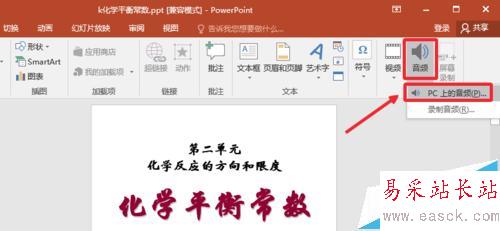 2、然后插入中選擇音頻中的PC上的音頻,如圖所示點擊打開。