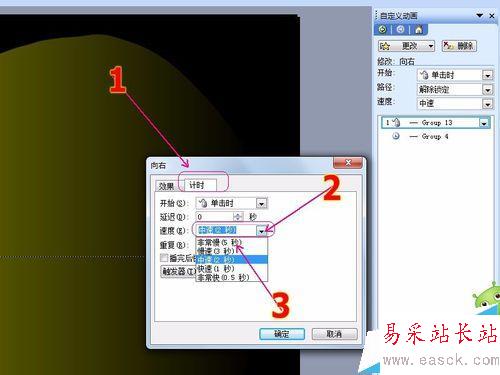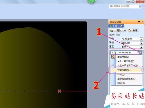1)選擇動畫工具欄中的動作1,選擇右面的向下的“三角”,選擇效果。然后出現效果選項對話框。