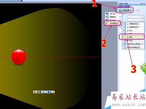 1、添加藍色小球的動畫。選中小球,選擇“自定義動畫”工具欄的中的“添加動畫”,選擇“動作路徑”,選擇“向右”。小球自動添加一個向右的箭頭,標志向右的動作。