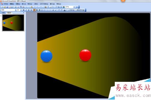 1、新建一個PPT文檔。在文檔中放置兩個小球,設置必要的背景效果等等。