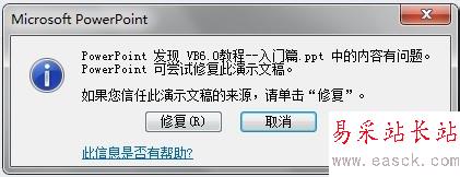 最近從網上下載了一些PPT格式的文件,后綴名有.ppt 也.pptx的兩種不同版本的文件,打開始終出現:PowerPoint發現 **.ppt中的內容有問題。PowerPoint可嘗試修復此演示文稿。如果您信任此演示文稿的來源,請單擊“修復”。讓同事在他們自己電腦上,都是可以打開的,就我的電腦不能打開,很是郁悶