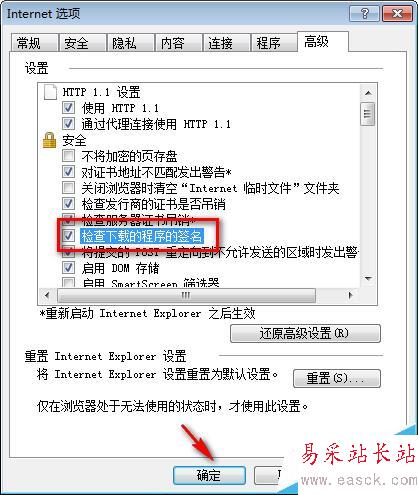 2、找到“檢查下載的程序的簽名”,取消它的勾然后確認就可以了。