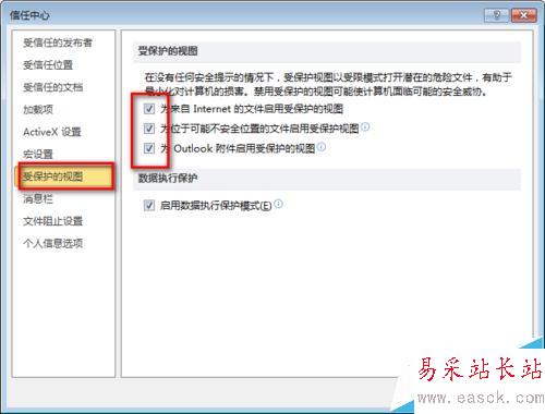 3、在彈出的窗口中,把右側“受保護視圖”下的三個勾選項取消即可。