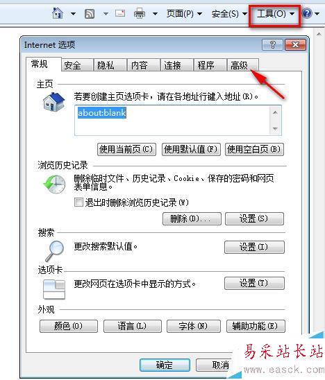 1、打開IE瀏覽器,點工具菜單,點Internet選項,然后選擇“高級”選項卡。