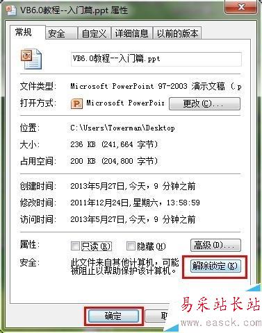 3、只需右擊打不開的PPT文件,點擊“屬性”→“解除鎖定”→“確定”即可。