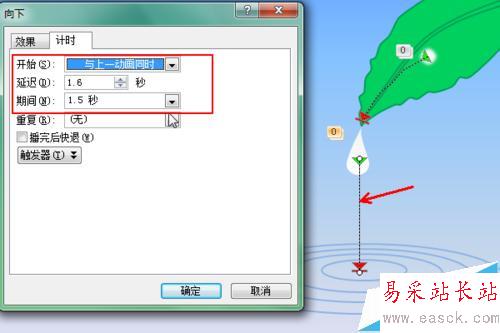 7、還是選中葉尖的露珠,添加向下的路徑效果,點擊“計時”,設置為“與上一動畫同時”,延遲1.6秒,期間1.5秒,點擊“效果”,平滑開始設置為0.6秒,設置“播放動畫后隱藏”