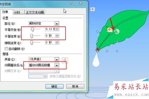 5、圖形繪制完成之后,開始添加動畫效果,先選中葉子和上面的露珠添加動畫效果“淡出”,均設置為與上一動畫同時,接著給露珠添加一個“弧線”路徑,方向沿著葉子脈絡向葉尖方向移動,路徑的效果設置為與上一動畫同時,平滑開始0.13秒,播放動畫后隱藏,如圖所示