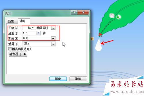 6、葉尖位置的淚滴形為露珠滾落形成,添加“淡出”效果,設置與上一動畫同時,延遲1.3秒,期間0.2秒