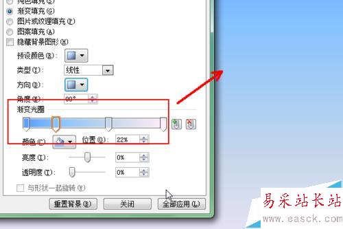 1、打開PPT,設置背景為藍白漸變,由上到下,由藍變白,使用線性填充,漸變光圈的位置適當調整,如圖所示