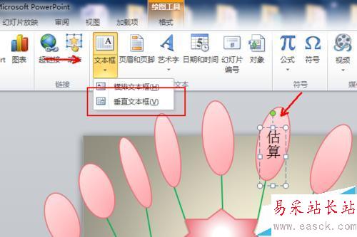 7、然后點擊插入,文本框,選擇繪制垂直文本框,在一個橢圓里面畫出一個文本框來,輸入文字,設置好文字的格式