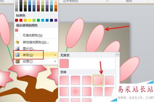 6、繼續點擊插入,選擇橢圓,依次在每個直線末端上繪制一個橢圓,分類越多,橢圓越多,需要控制橢圓的寬度,還是使用漸變填充,不過這次是有下到上的填充,粉色系