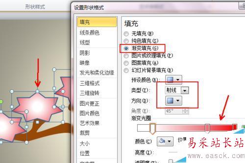 4、接著按住Ctrl逐一選擇所有的星型,然后點擊形狀填充,選擇漸變——其他漸變,點選漸變填充,類型為射線,方向為中心輻射,中心的顏色設置位白色,向紅色漸變,點擊確定,點擊形狀輪廓,將粗細設置位1.5磅,如圖