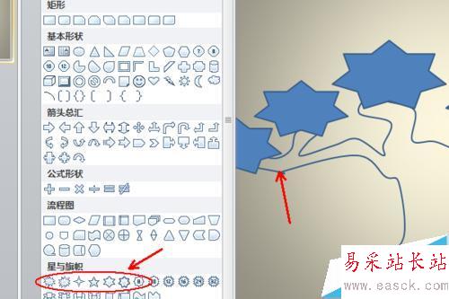 2、還是點擊插入,選擇七角星,也可以選擇其他的星型或是橢圓之類的形狀,根據自己的喜好來,在樹干上繪制七角星,有幾個大類就畫幾個
