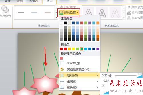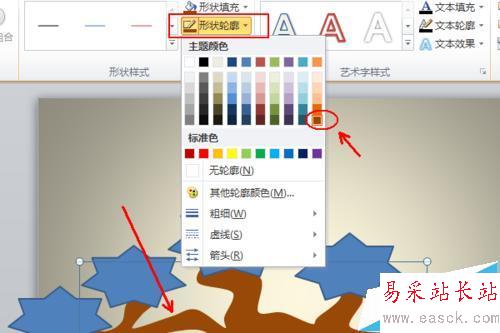 3、選中樹體,切換到繪圖工具,點擊形狀輪廓,選擇為棕色,還有形狀填充也選擇棕色,如圖所示