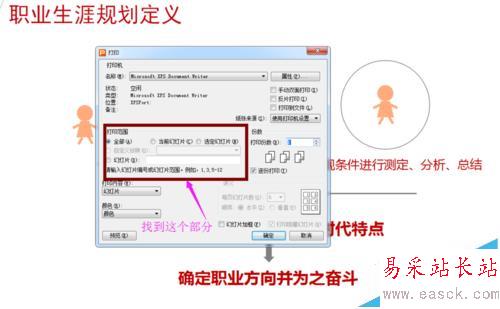 5、在“打印范圍”部分有兩種打印方法,上面一種是全部打印,這是默認的打印模式。但是如果只需要打印其中某幾頁,就要選擇第二種“幻燈片”。