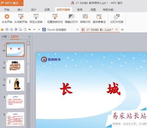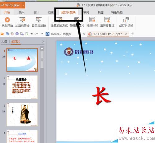 2、在打開的ppt上方菜單欄中尋找“幻燈片放映”并單擊