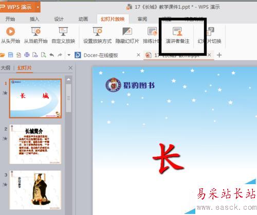 3、單擊之后會在幻燈片放映的下方出現一個子菜單,在這里尋找“演講者備注”并單擊