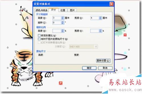 3、選中插入的十二張生肖圖片,雙擊,進(jìn)入“設(shè)置對(duì)象格式”對(duì)話框,單擊“尺寸”標(biāo)簽,設(shè)置高度為3厘米,寬度為4厘米,如圖所示,單擊“確定”按鈕完成設(shè)置