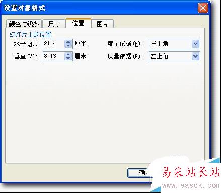 6、第十二張豬的圖片位置水平為25.4cm-4cm=21.4cm,雙擊十二張豬的圖片,進(jìn)入“設(shè)置對(duì)象格式”對(duì)話框,單擊“位置”標(biāo)簽,設(shè)置水平為21.4厘米,如圖所示,單擊“確定”按鈕完成設(shè)置。