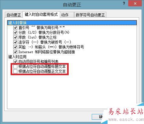 3、在“自動更新選項”對話框-“鍵入時自動套用格式”標簽頁,去除“根據(jù)占位符自動調(diào)整標題文本”,“根據(jù)占位符自動調(diào)整正文文本”。并按“確定”完成配置。