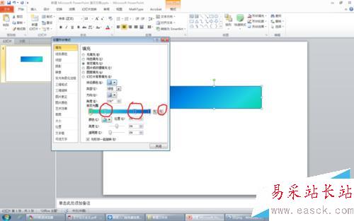 3、把剩下的“漸變光圈”橫條上的兩個小筆尖重合,可以看到此時矩形框的兩種顏色嚴格分割