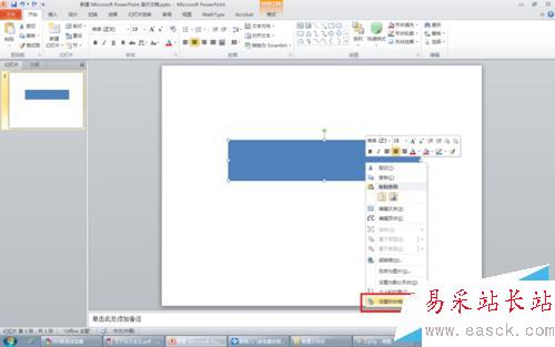 1、首先要打開PPT文檔,從繪圖中選擇矩形,選中矩形右鍵單擊選擇“設置形狀格式”。選擇“填充”——“漸變填充”