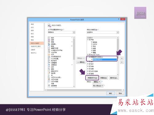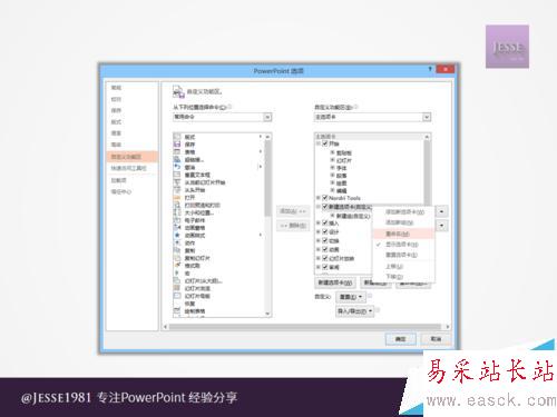 5、為了方便后續(xù)的使用,右鍵分別點擊“新建選項卡”和“新建組”,將它們進行重命名