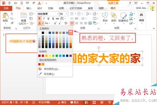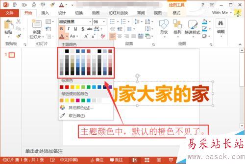 1、打開PPT之后,按照慣例修改下突出字體的顏色為橙色,可是這次卻把我愣住了。原本該有的橙色,卻消失不見了。